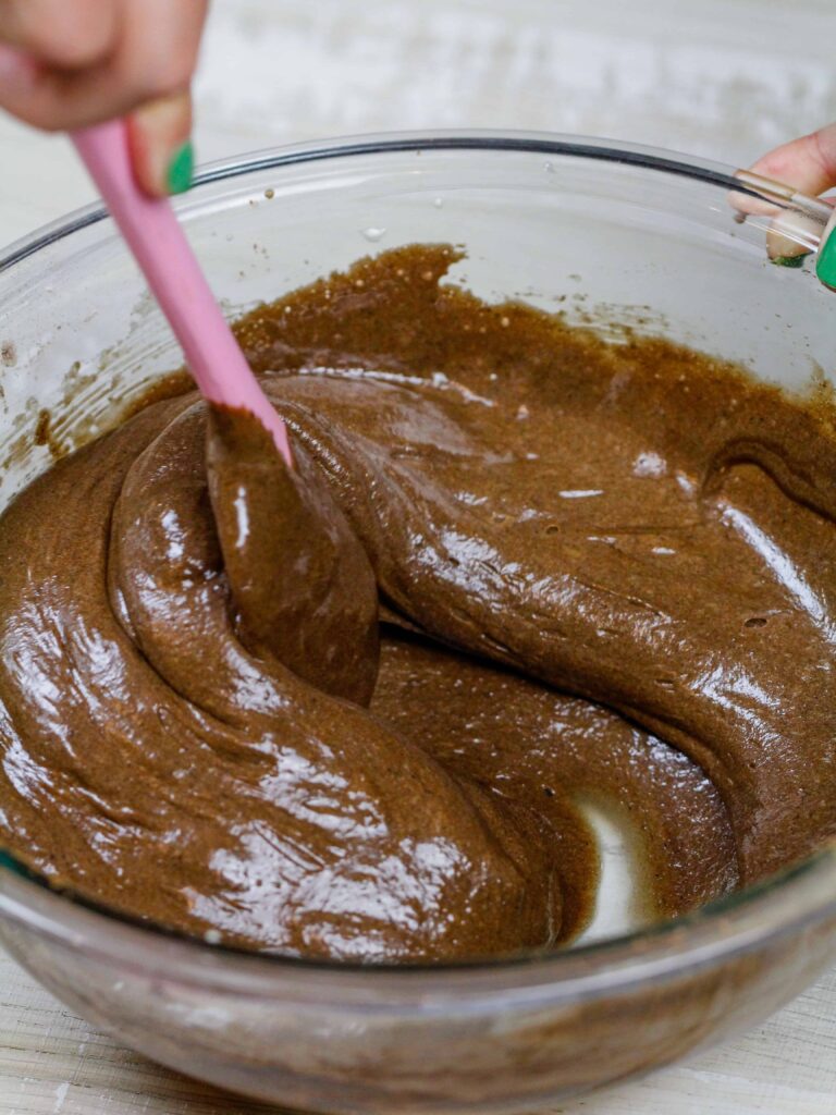 第一步是一旦添加到无麸质面粉中,就可以将布朗尼面糊混合几分钟,以帮助其结构。