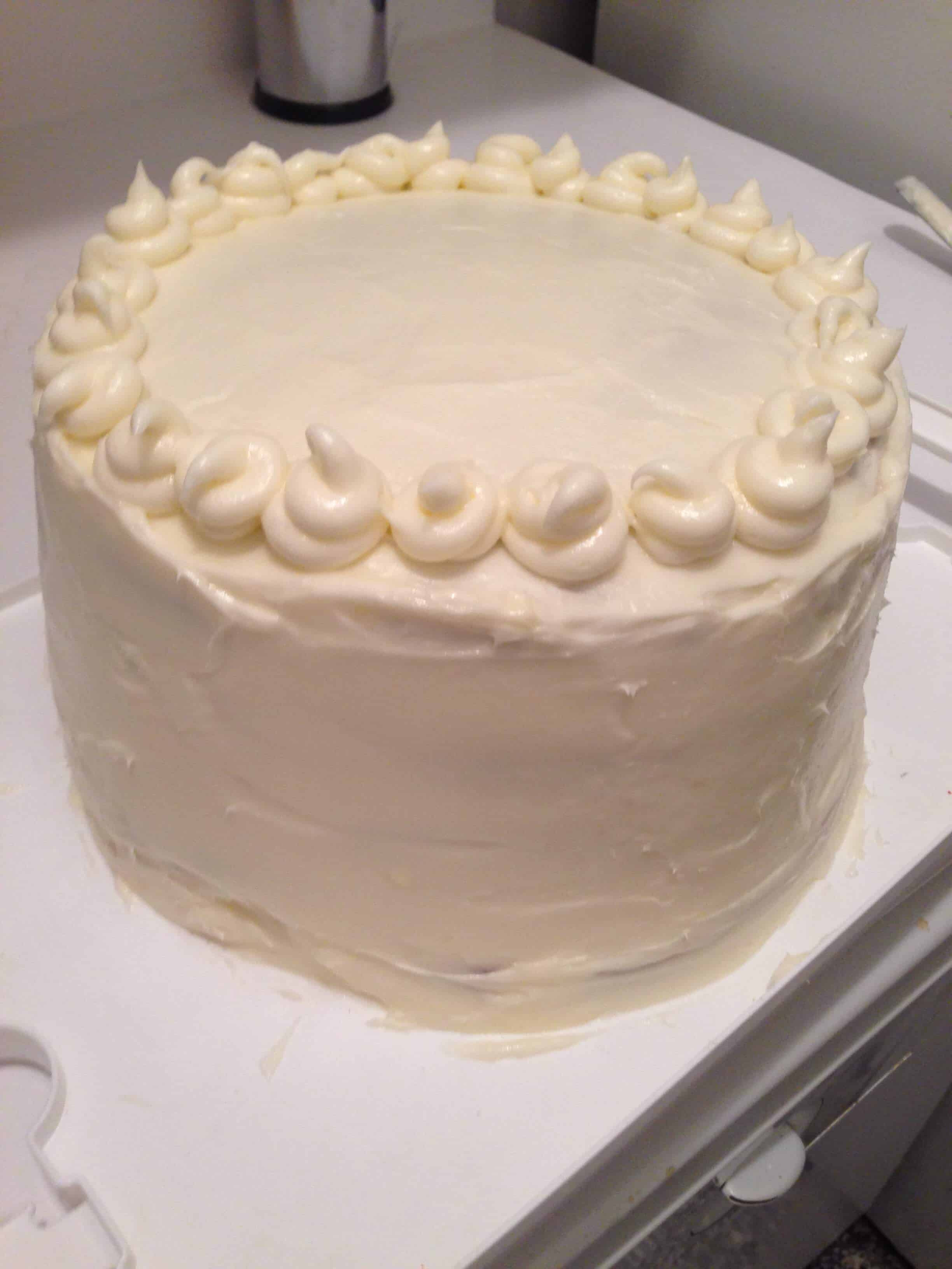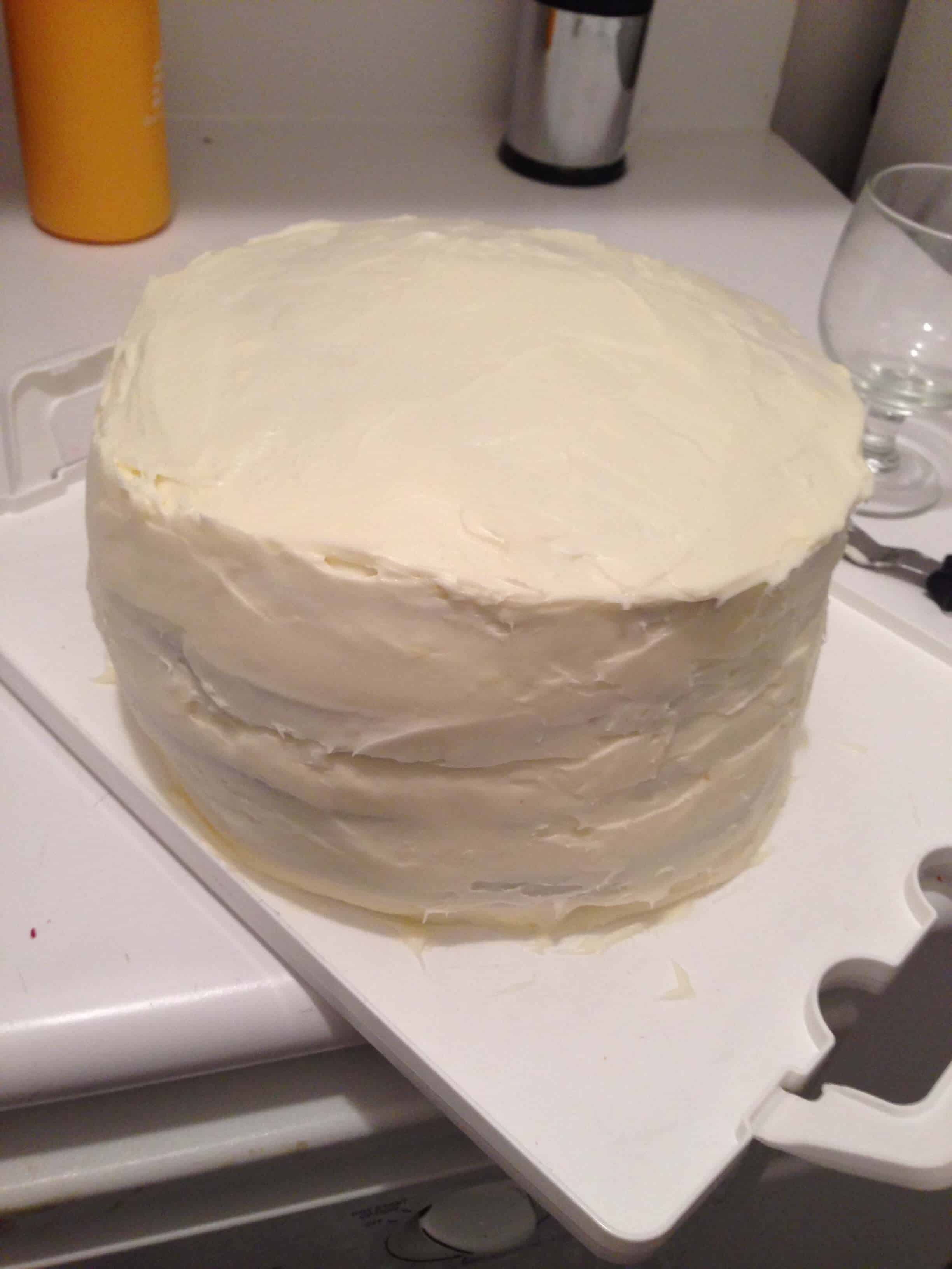 蛋糕完全冷却后,用奶油奶酪糖霜冻结了蛋糕。