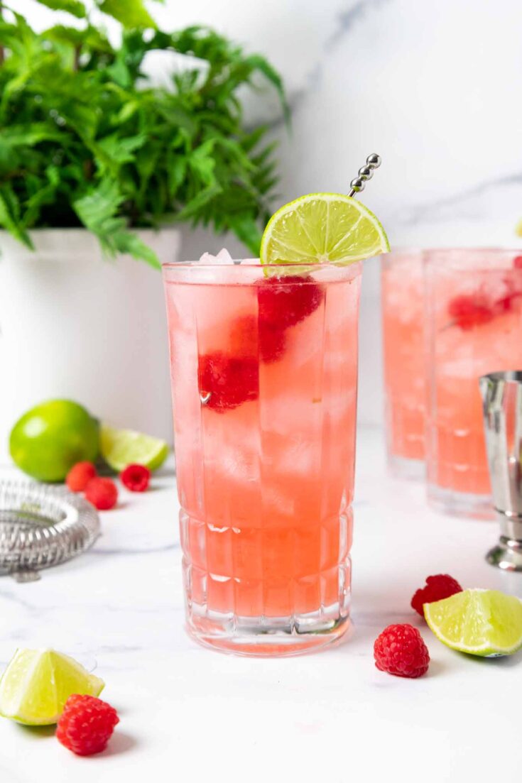 进入振动仪2盎司。杜松子酒,1盎司。柠檬汁和1盎司。覆盆子简单糖浆。