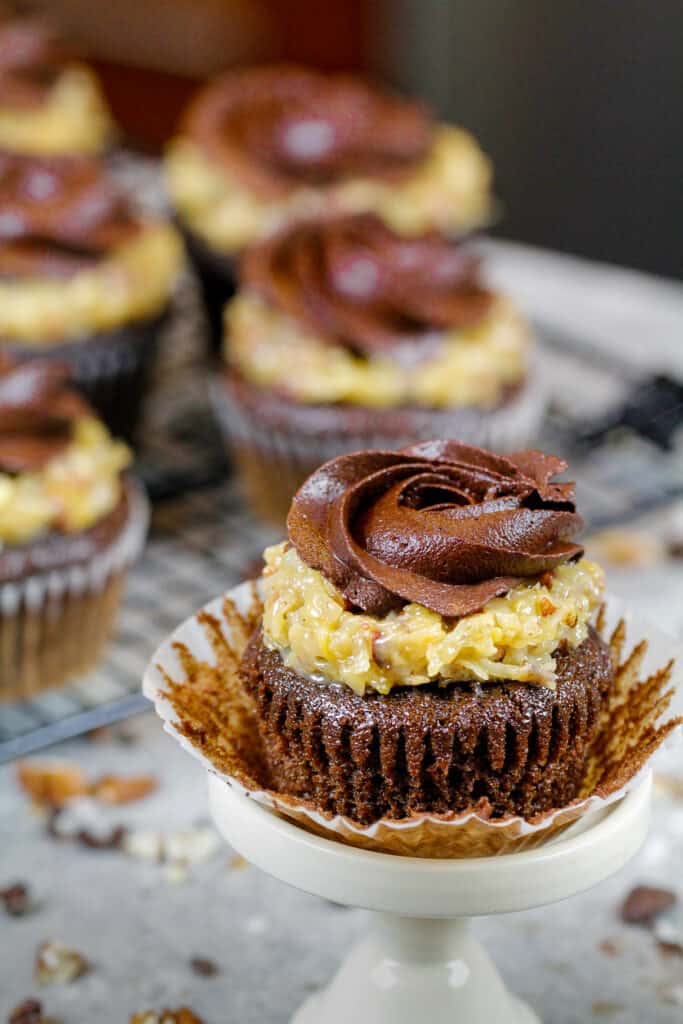 - To decorate these german chocolate cupcakes, use a cookie scoop to add a generous dollop of cooled coconut pecan filling on top of each cupcake. If you don't have a cookie scoop, use a large spoon to add about 1 Tbsp of filling on top of each cupcake.