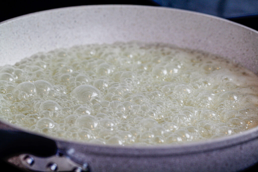 - 设置一个定时器,然后将黄油和糖的混合物放在炉子上加热45秒,直到整个混合物的顶部都充满了泡沫/沸腾。