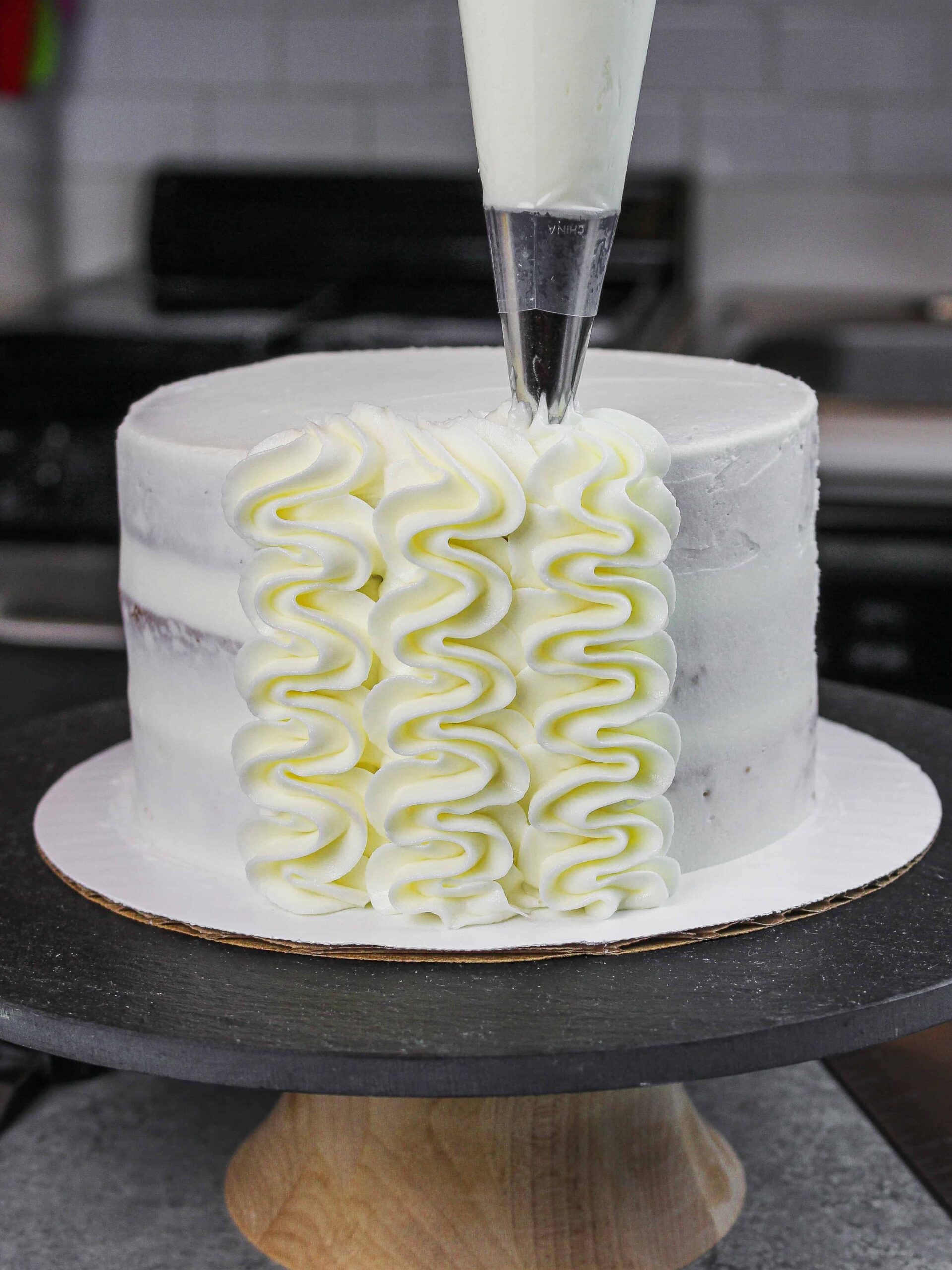 面糊休息时,您可以找出你想装饰你的无谷蛋白蛋糕!为了简单起见,我决定通过管道结霜曲线边的蛋糕威尔顿1 m糖霜小费。