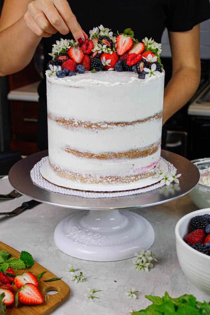 考虑到这一点,我决定堆在我的蛋糕中使用的相同的新鲜浆果填充在这个蛋糕之上。我还在蛋糕顶部添加了一些小型的季节性食用花朵作为整理触感。