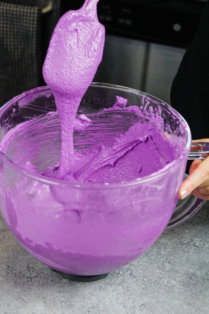 - 向鸡蛋中加入55克砂糖,中速搅拌30秒。如果需要的话,在此时加入紫色凝胶食用色素,然后将搅拌速度提高到中高速。继续搅拌,直到形成坚硬、有光泽的山峰。