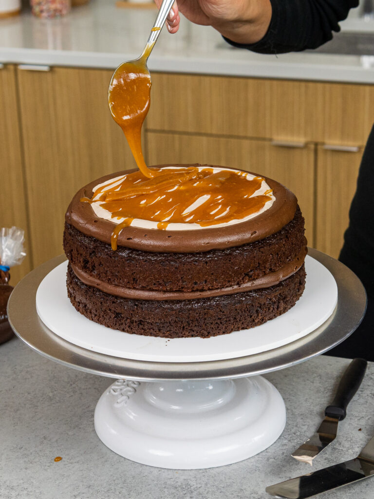 你组装蛋糕,管一环巧克力奶油乳酪在每个蛋糕层。传播约1/3的松软的巧克力蛋糕奶油乳酪环内填充。慷慨的细雨的焦糖。