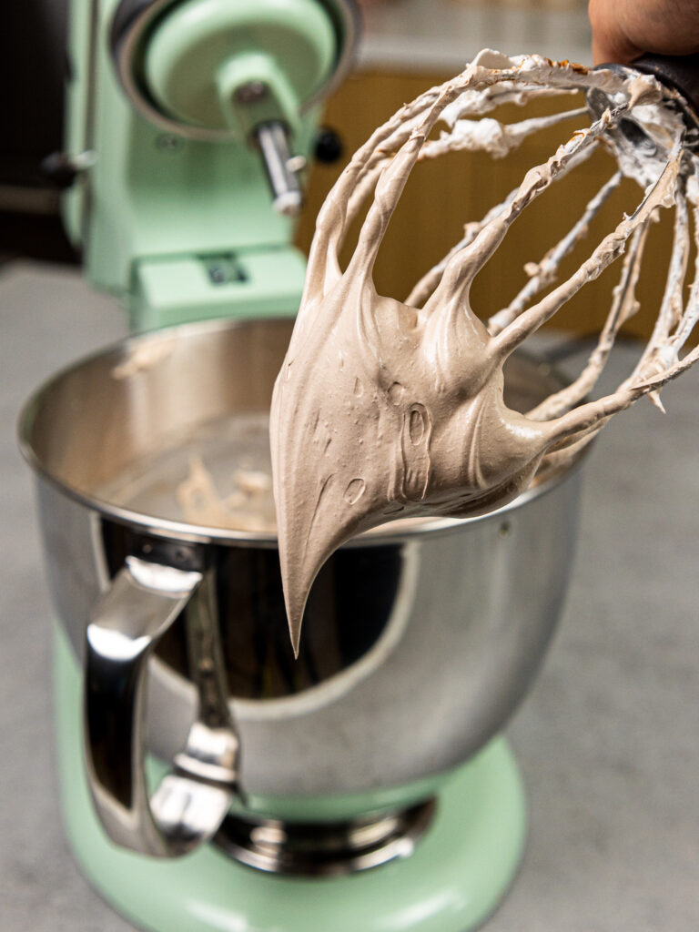 熄火,加入香草精。使用手持或带有搅蛋器打站搅拌机高速约5分钟,至表面光滑的僵硬。