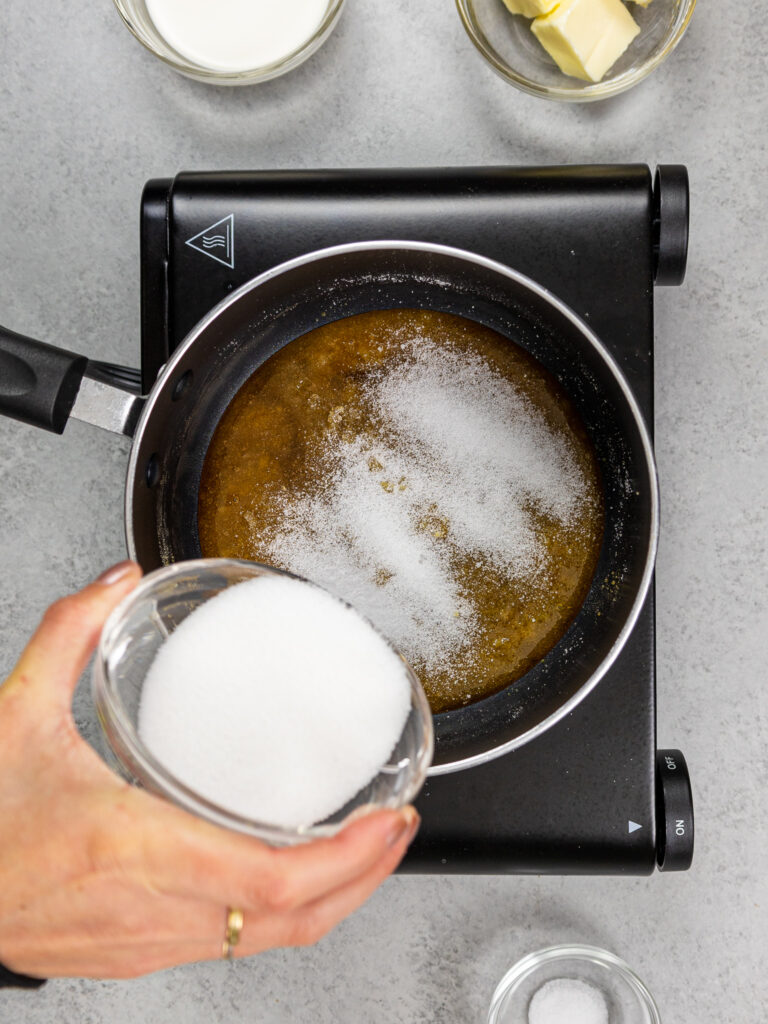 放置一个中锅在介质中高温。逐渐倒入1杯糖,加入1/4杯。等到糖主要是溶解,然后加入下一个糖。