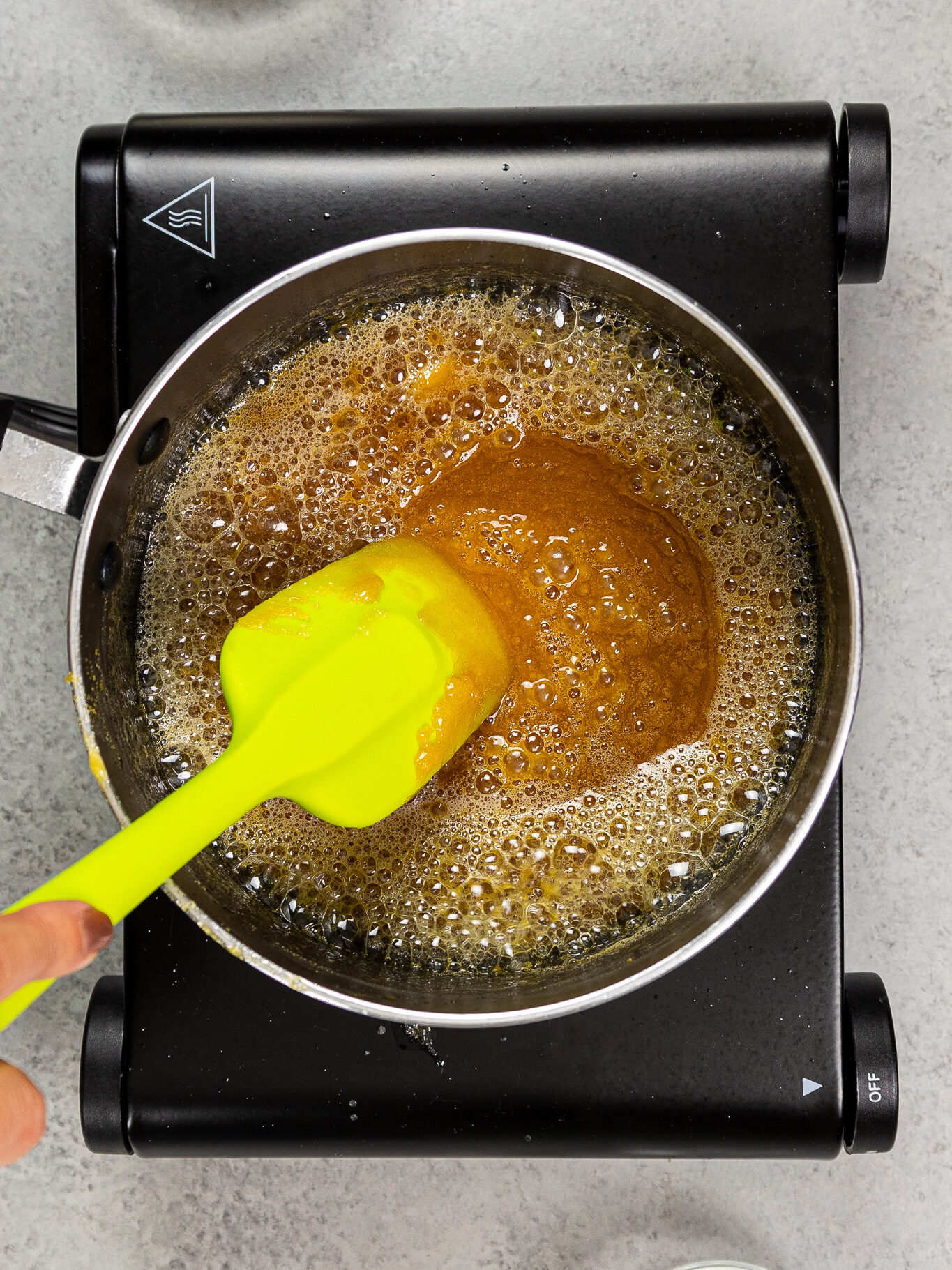5. 偶尔搅拌,直到糖完全溶解,成为一个琥珀色,然后关火。