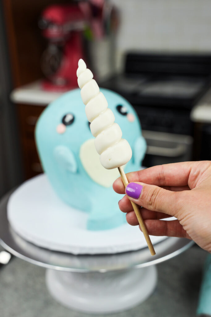 - 蛋糕冷却,将1/3杯白色软盘卷成长,锥形的日志。在木串周围扭曲这一点,以制作Narwhal的角。