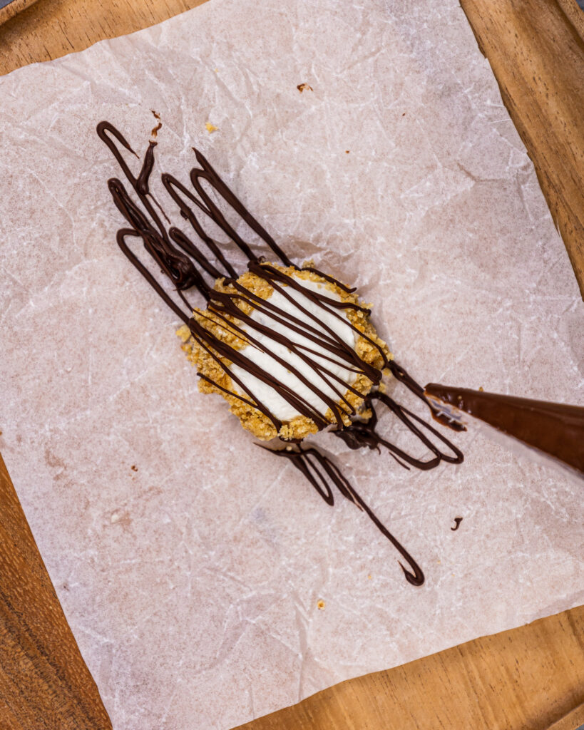 - 将芝士蛋糕球从冰箱中取出,然后将每个球的下半部分压入木饼干混合物中。将它们放在一张干净的羊皮纸或蜡纸上,然后在每口咬的顶部淋上融化的巧克力。