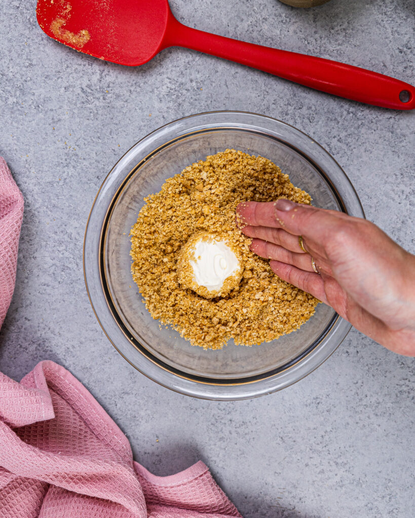 将芝士蛋糕球从冰箱中取出,然后将每个球的下半部分浸入Graham Cracker混合物中。