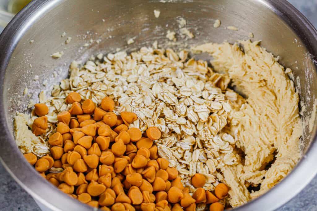 - 用橡皮刮刀搅拌1杯半燕麦片和1杯奶油糖果饼干。此时面团应该非常粘稠!
