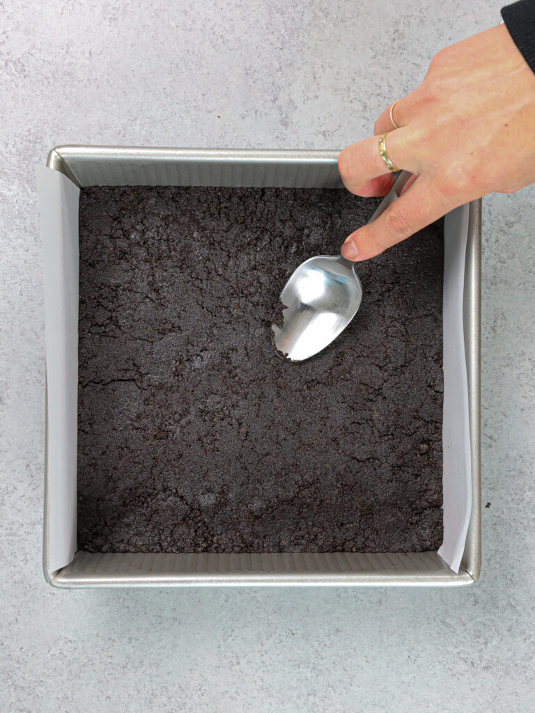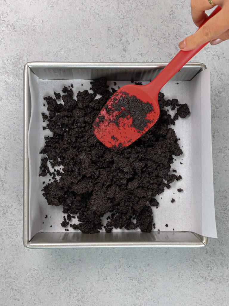 - 将1 1/2杯压碎的Oreo Cookie碎屑与1/4杯融化的黄油混合。压入准备好的锅中,并使用大勺子的背面平滑。