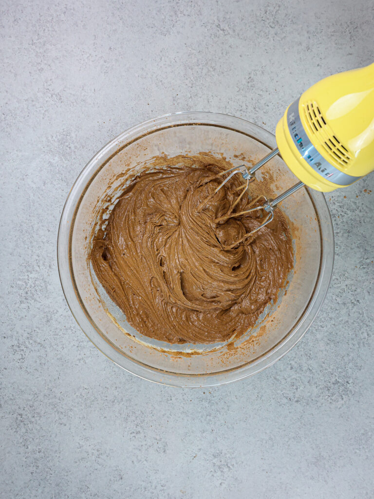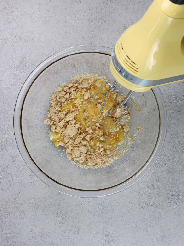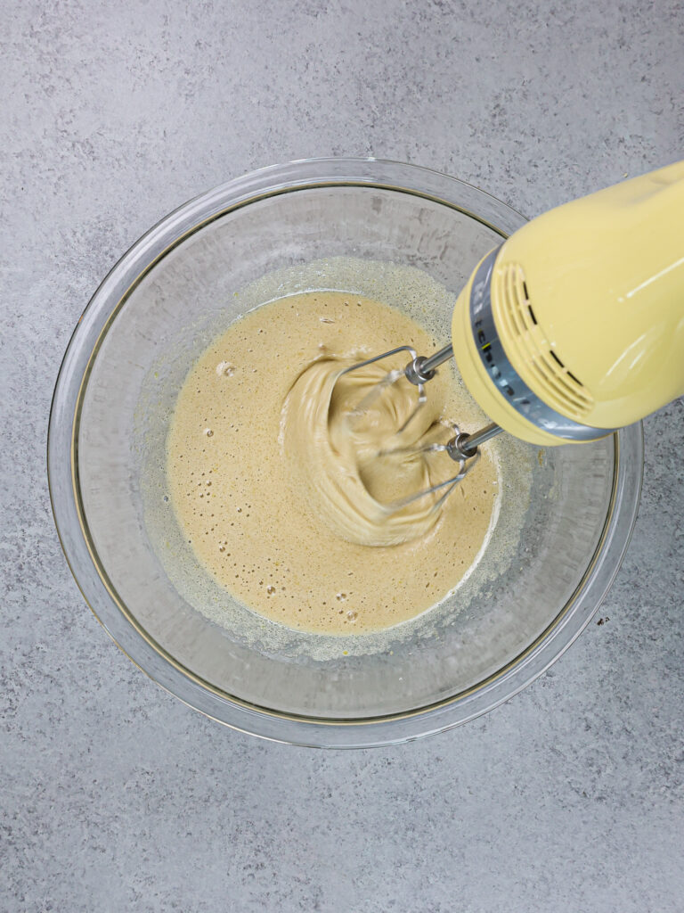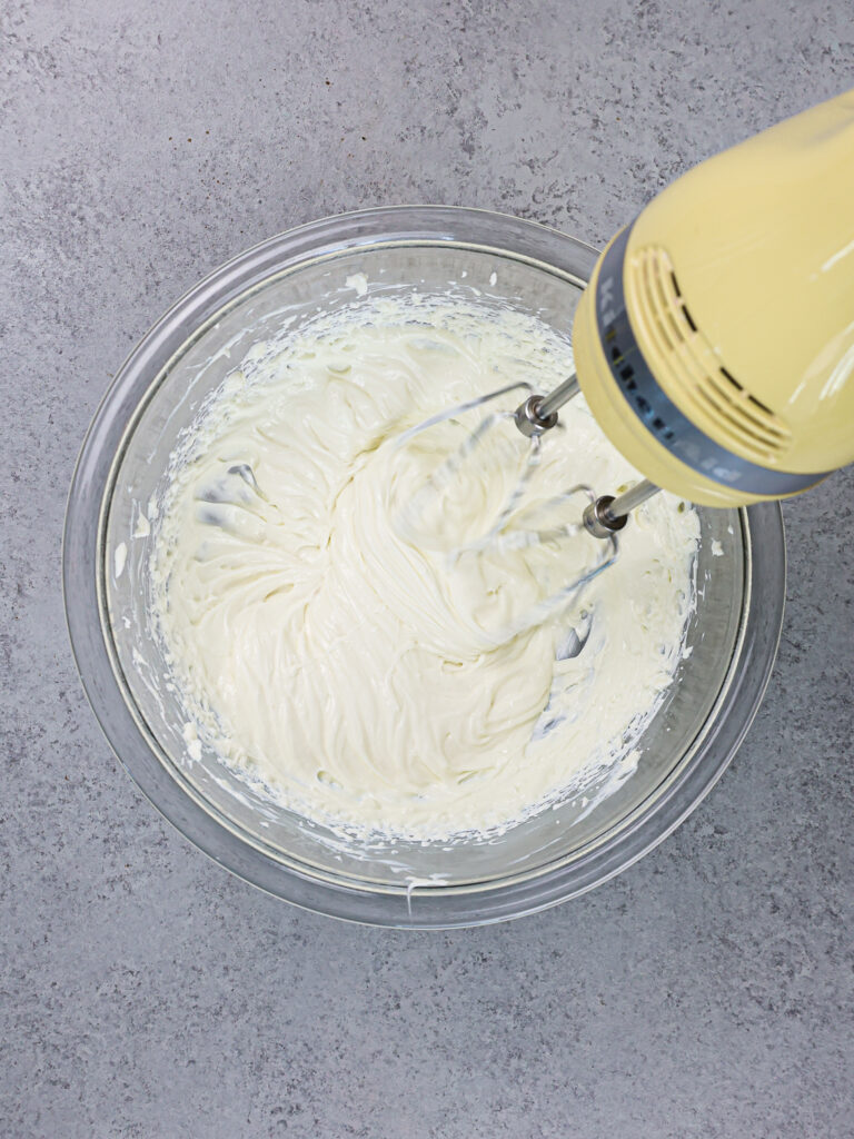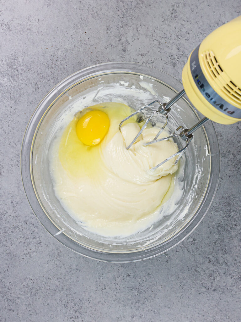 - 以中低速为止混合鸡蛋直至合并。在此阶段,芝士蛋糕应该看起来丝滑。