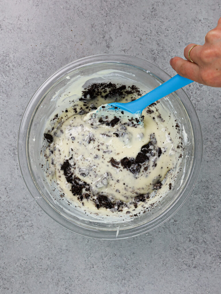 - 折叠1/2杯切碎的奥利奥。混合,直到它们均匀分布在整个面糊中。