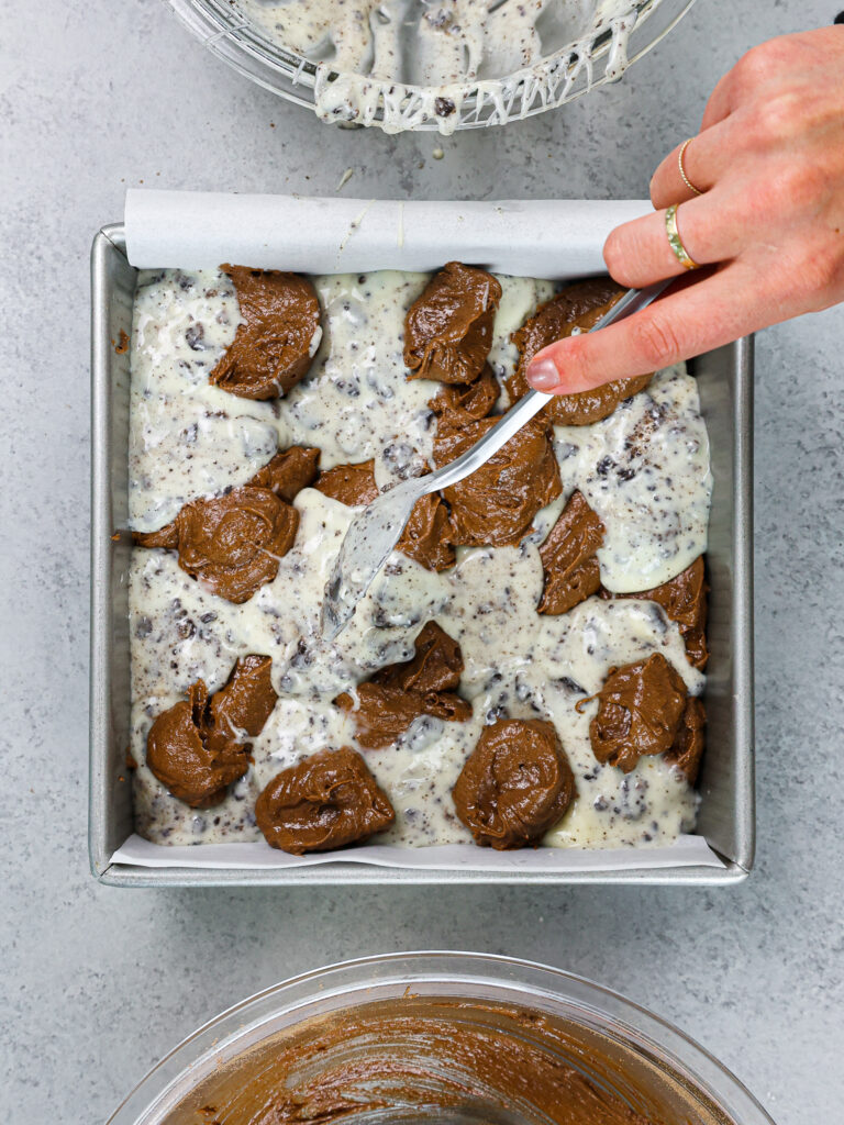 - 替代勺子布朗尼面糊和芝士蛋糕在奥利奥外壳的顶部填充。