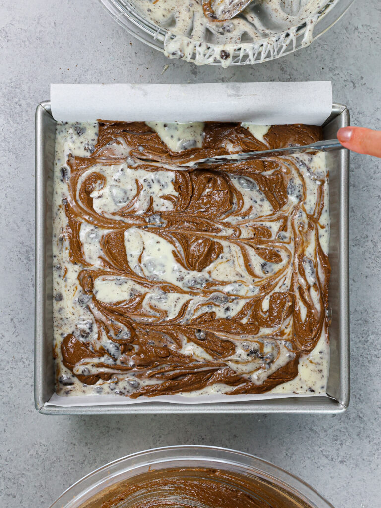 烘烤40-45分钟或直到布朗尼蛋糕的中心看起来固定。由于芝士蛋糕的漩涡,牙签测试将无法使用这些测试,因此我喜欢进行摇摆测试。