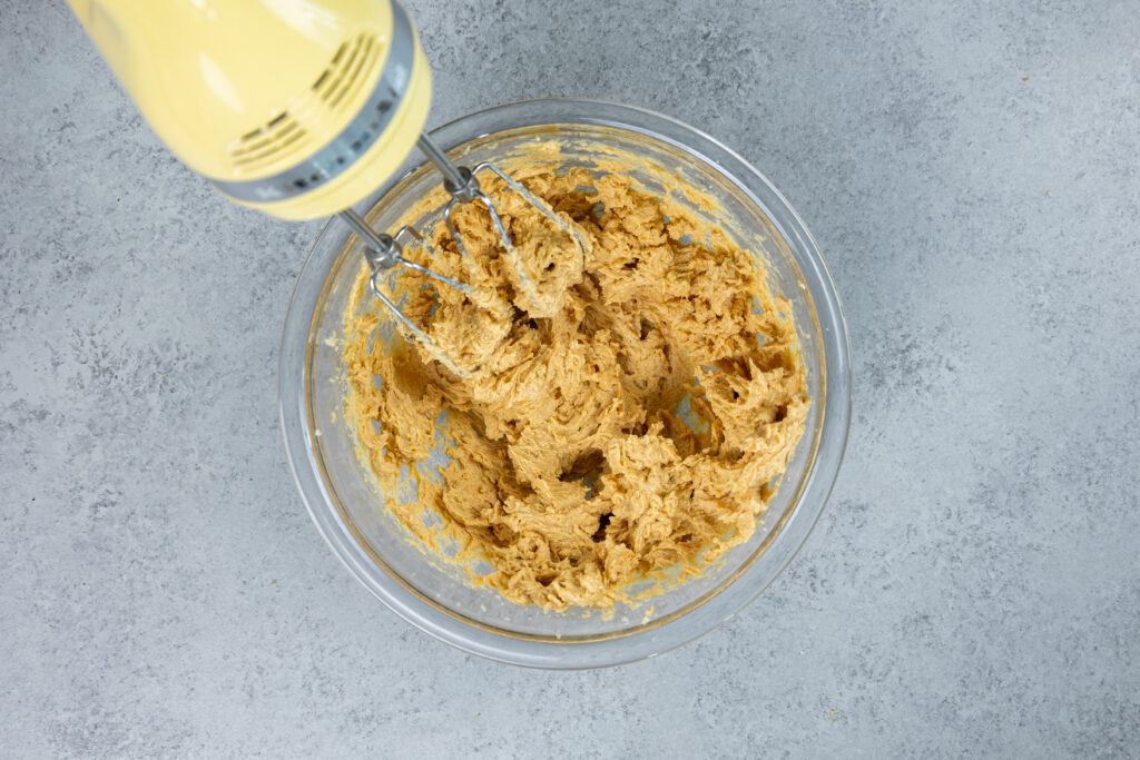 - 奶油黄油、红糖和白糖或手搅拌,直到混合物减轻站在颜色(约1分钟)。加入南瓜泥和混合在一个中速直到总和。
