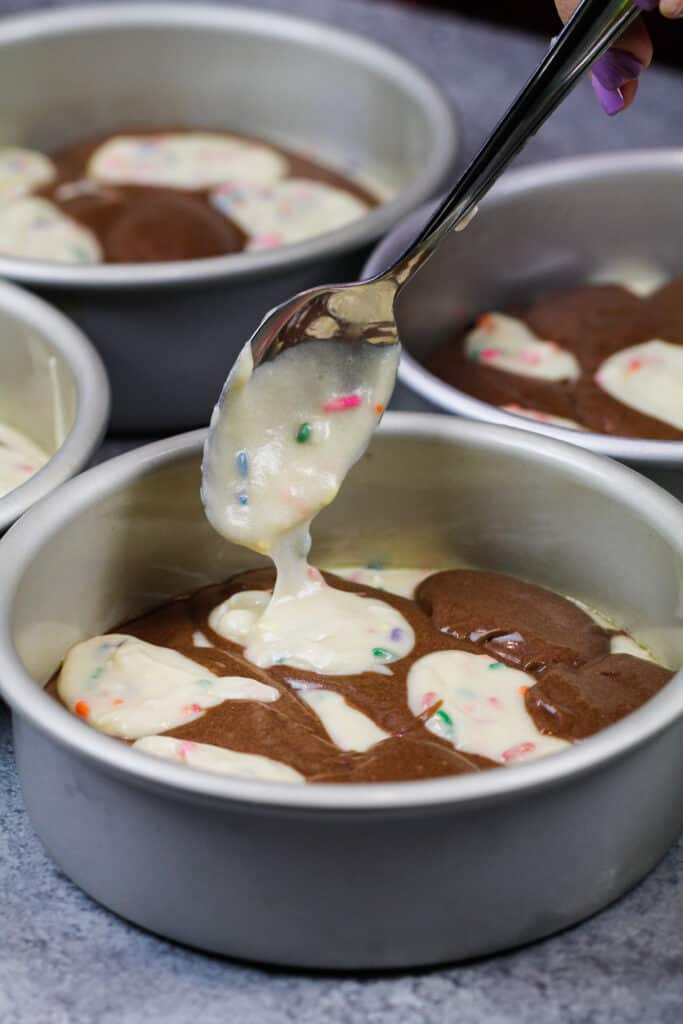 - 将巧克力和香草蛋糕面糊交替放入准备好的蛋糕锅中,填充大约一英寸高的面糊(我喜欢使用数字厨房规模确保每个平底锅具有相同的面糊)。