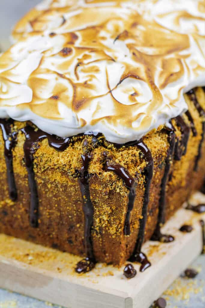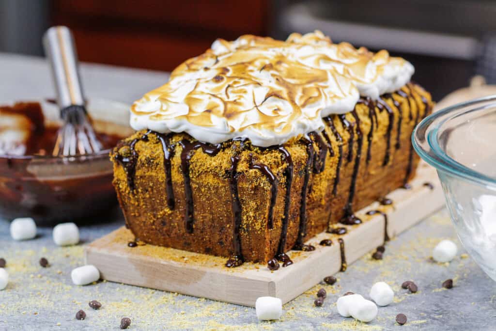 这个S'mores Banana面包只是美味,因为它很华丽!它淋上巧克力Ganache,配有烤棉花糖霜冻!