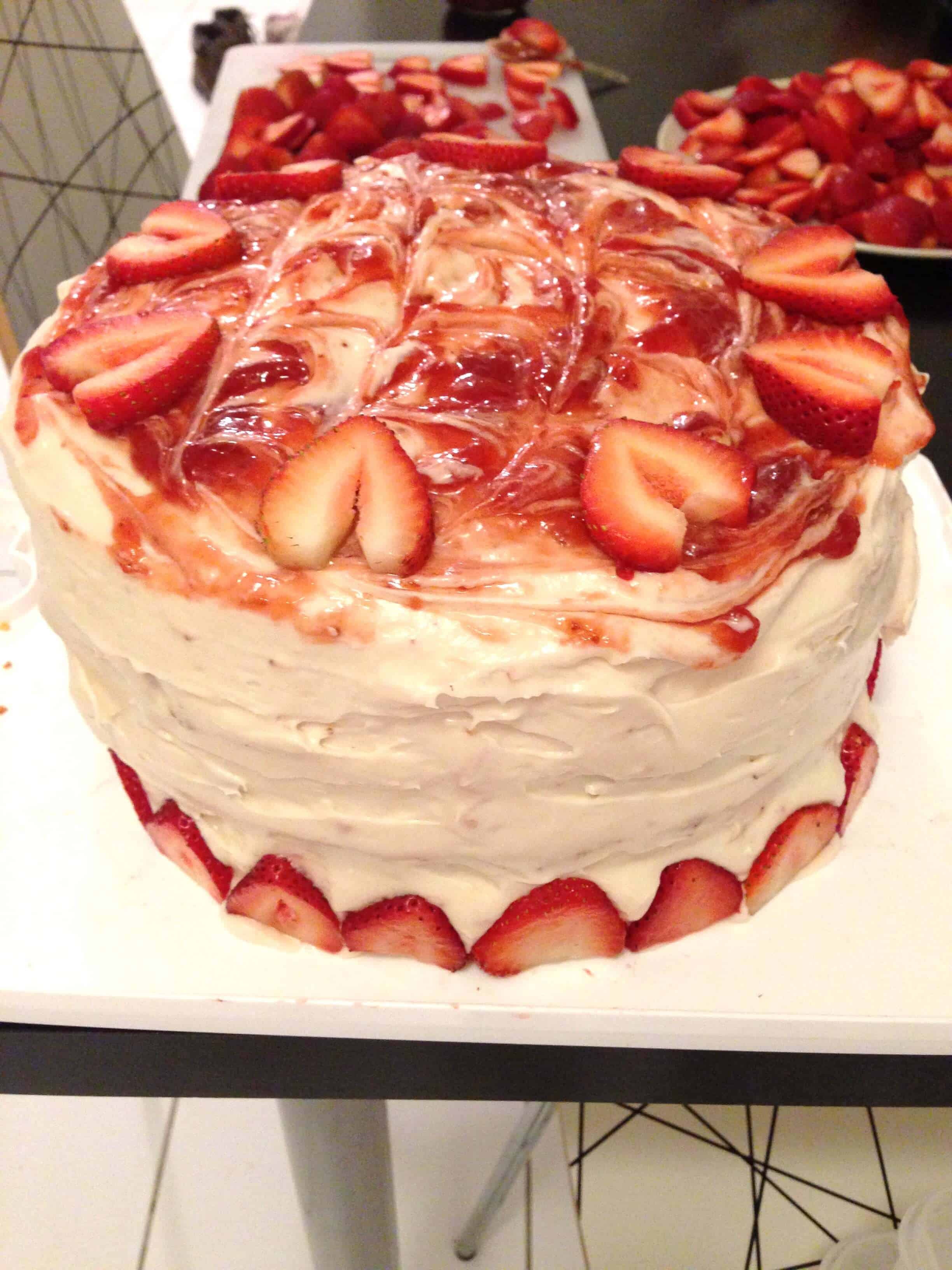 - 蛋糕层烘烤和凉爽,让草莓奶酪糖霜。