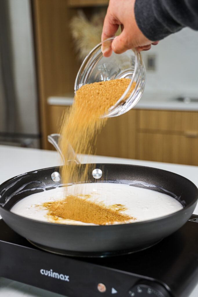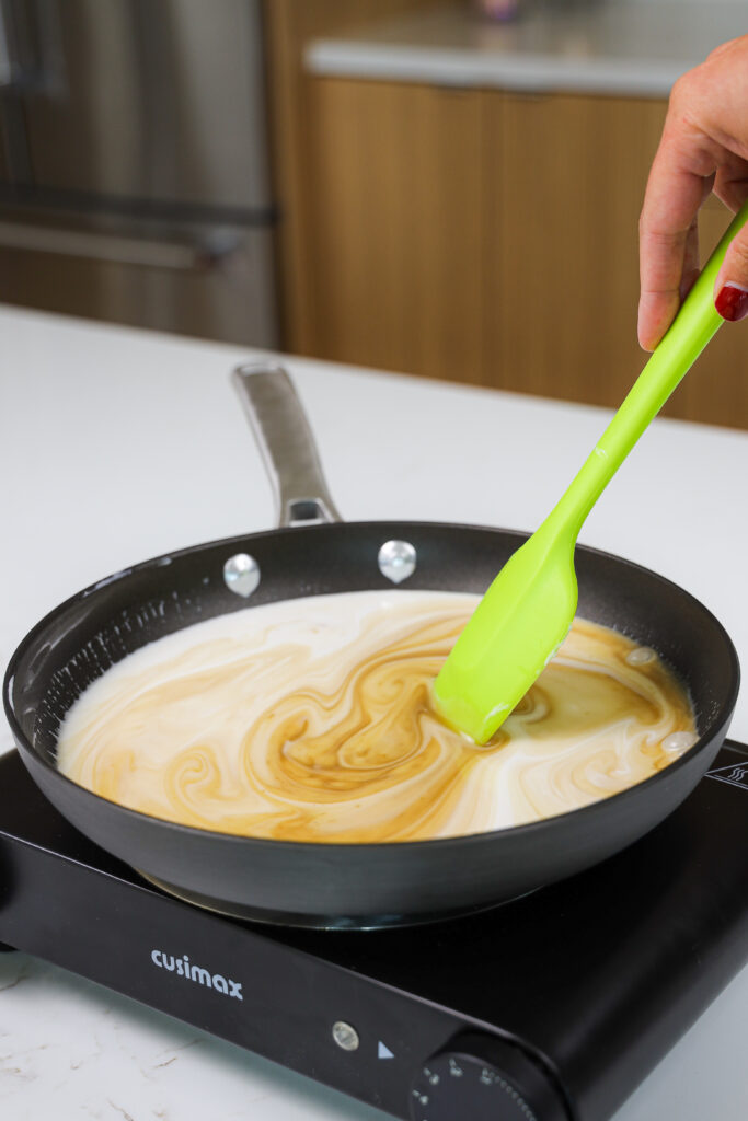 首先撅嘴椰奶和纯素食糖酱锅。热介质,搅拌,直到糖溶解。